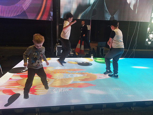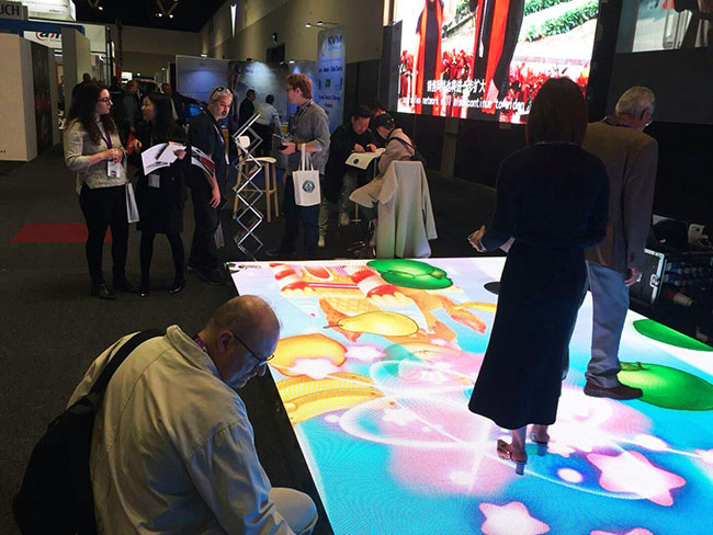 本次展出的P4.81 LED互动地砖屏,采用全新的纳米镀膜模式,在承重、防护性能、及散热性能等方面做过特殊设计,能适应高强度踩踏,长时间正常运行。其红外感应设计,可以跟踪人的运动轨迹,能够跟随人体的活动呈现即时的画面效果。